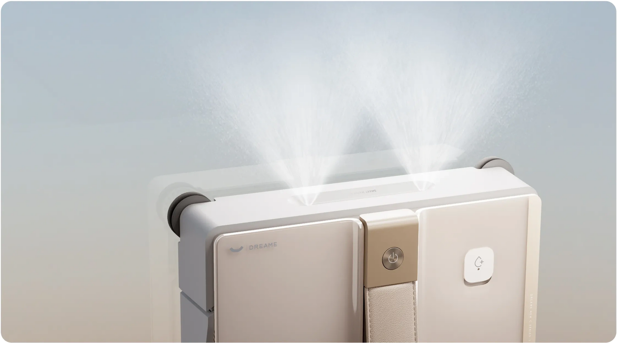Το δοχείο νερού χωρητικότητας 80 ml αποδίδει 60 λεπτά συνεχούς καθαρισμού. Η συχνότητα ψεκασμού προσαρμόζεται ανάλογα με τις καιρικές συνθήκες, ενώ η τεχνολογία παλμικού ψεκασμού και το πανί μικροϊνών αποτρέπουν τη δημιουργία σταγόνων και υπολειμμάτων.