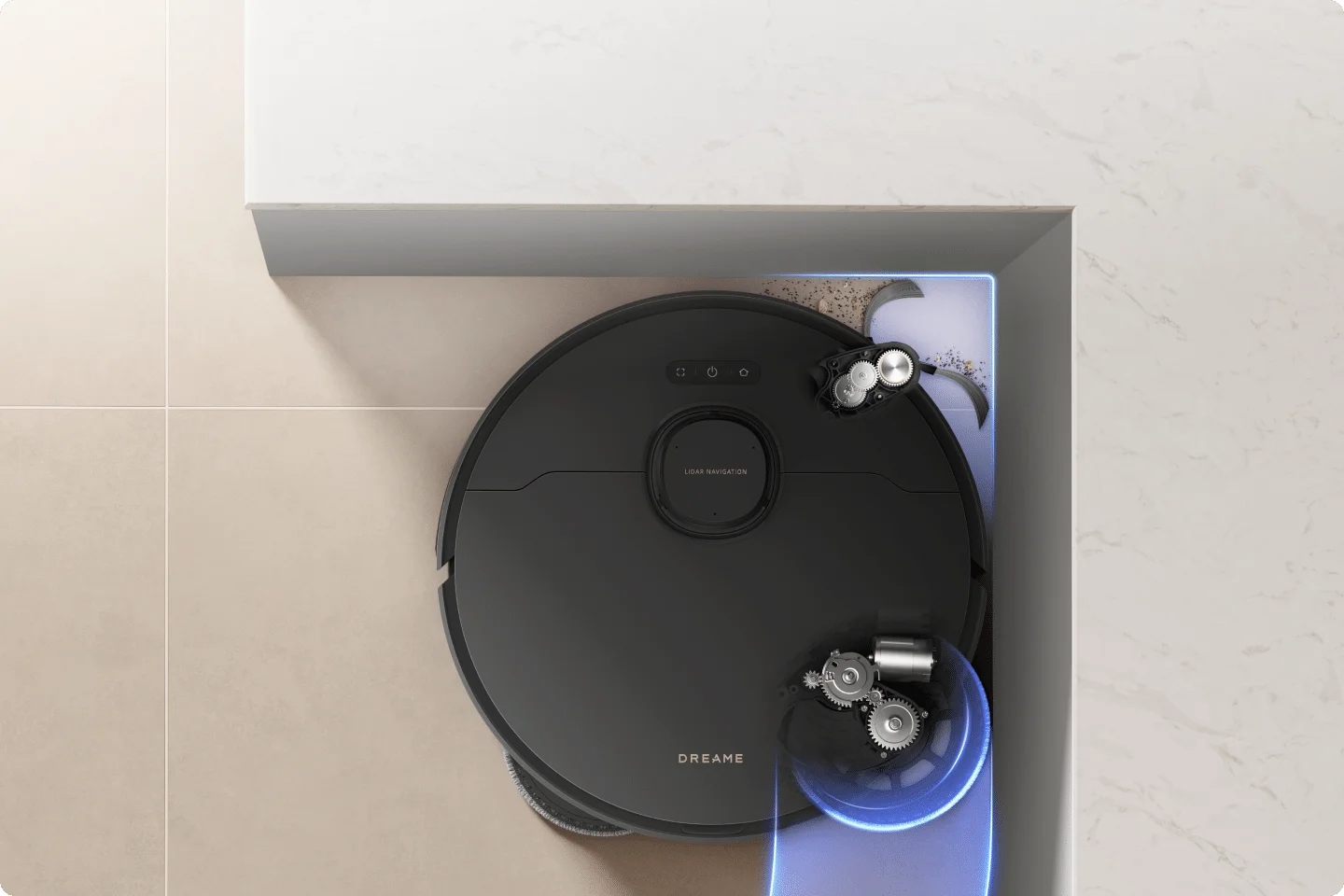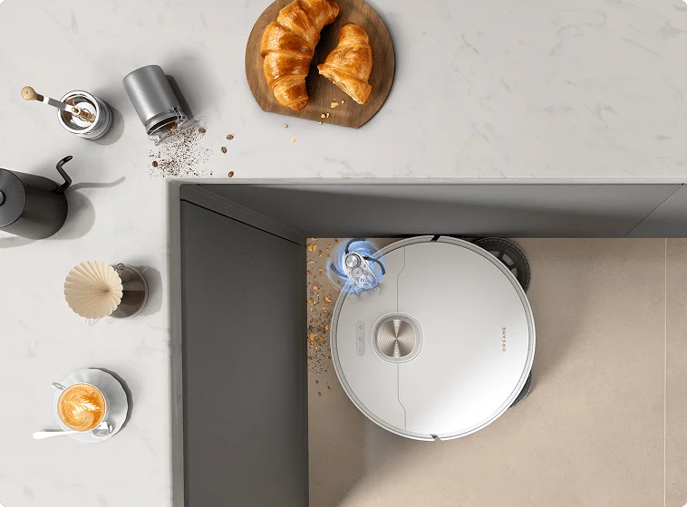 Η πλευρική βούρτσα προεκτείνεται αυτόματα για να φτάσει σε γωνίες και άκρες, σκουπίζοντας τα υπολείμματα από στενούς χώρους για πιο ολοκληρωμένη κάλυψη.