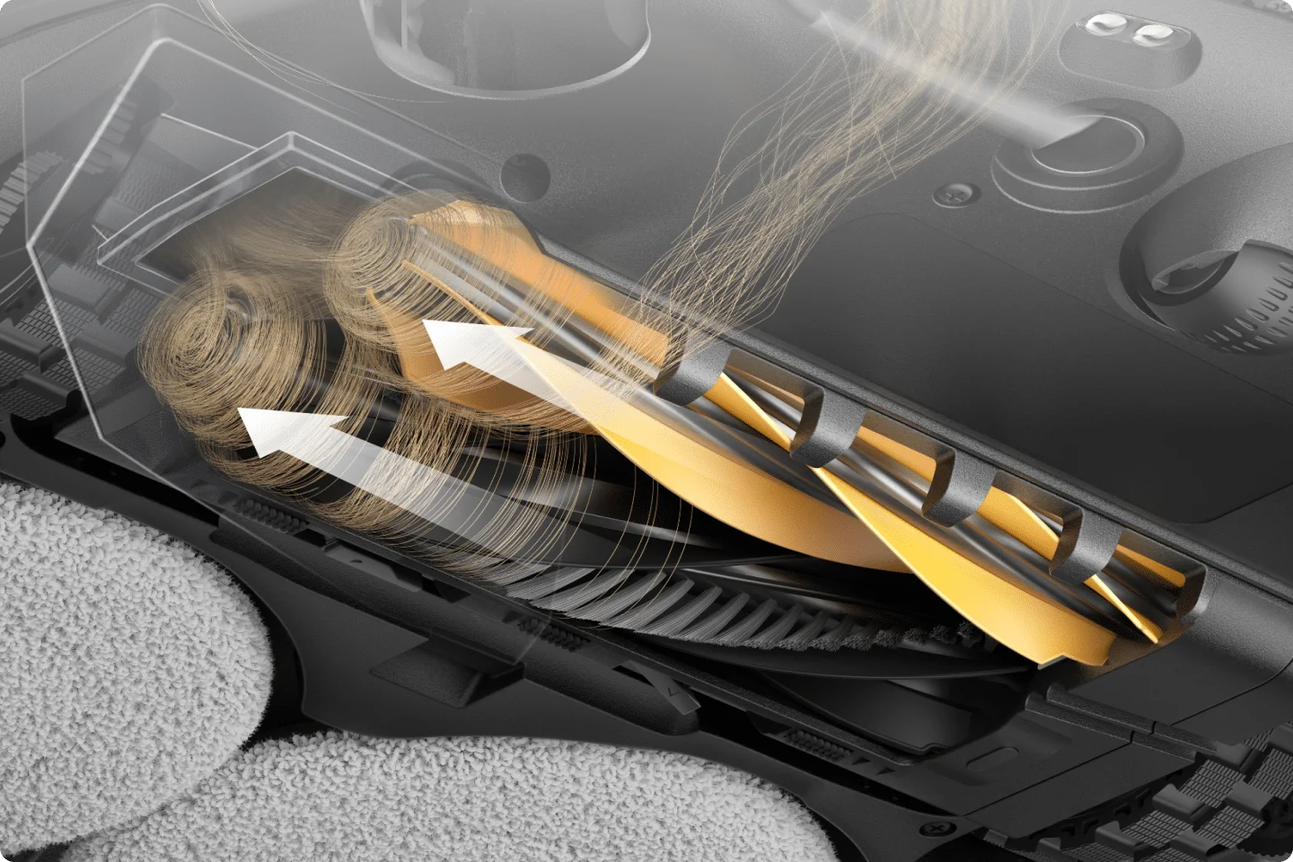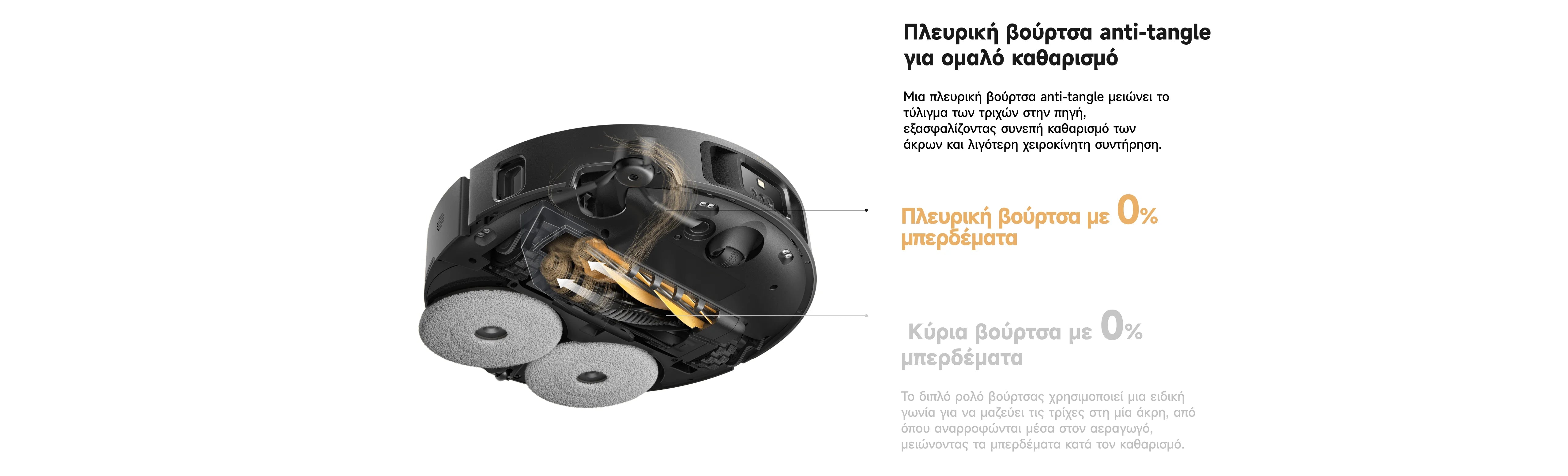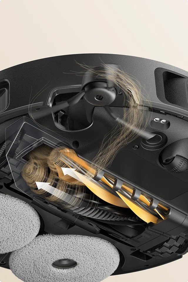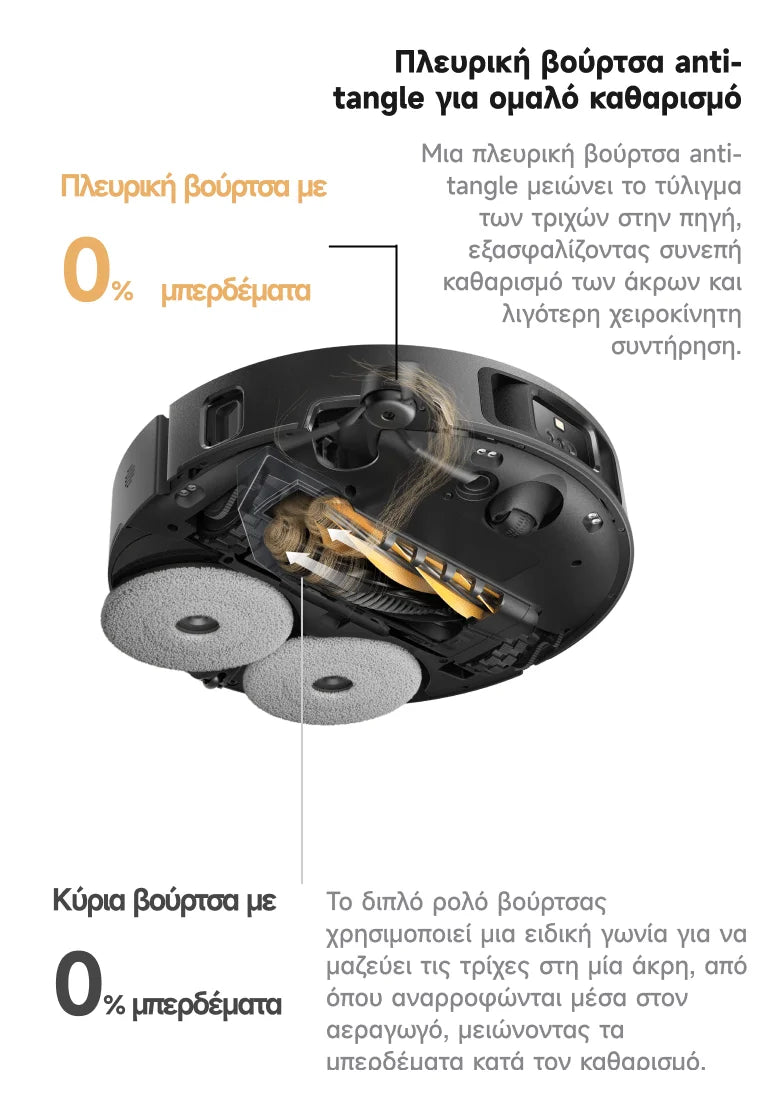 Οι διπλές βούρτσες μαζεύουν τις τρίχες από δάπεδα και χαλιά, κατευθύνοντας ομαλά τη ροή αναρρόφησης, μειώνοντας τα μπερδέματα και εξασφαλίζοντας πιο αθόρυβο και αποδοτικό καθαρισμό.