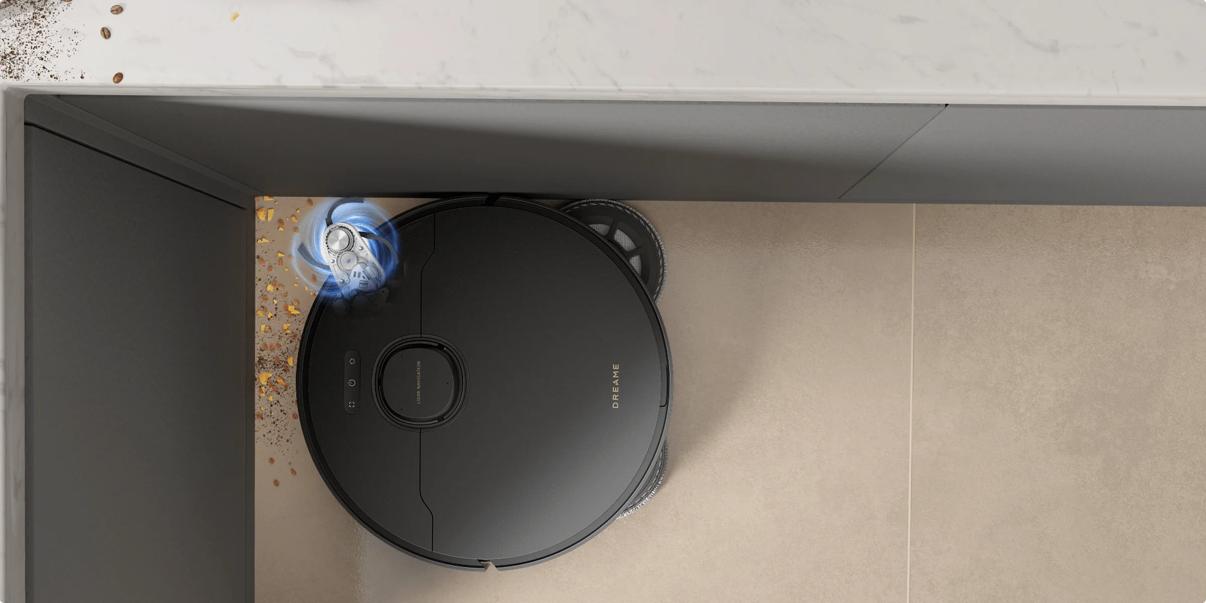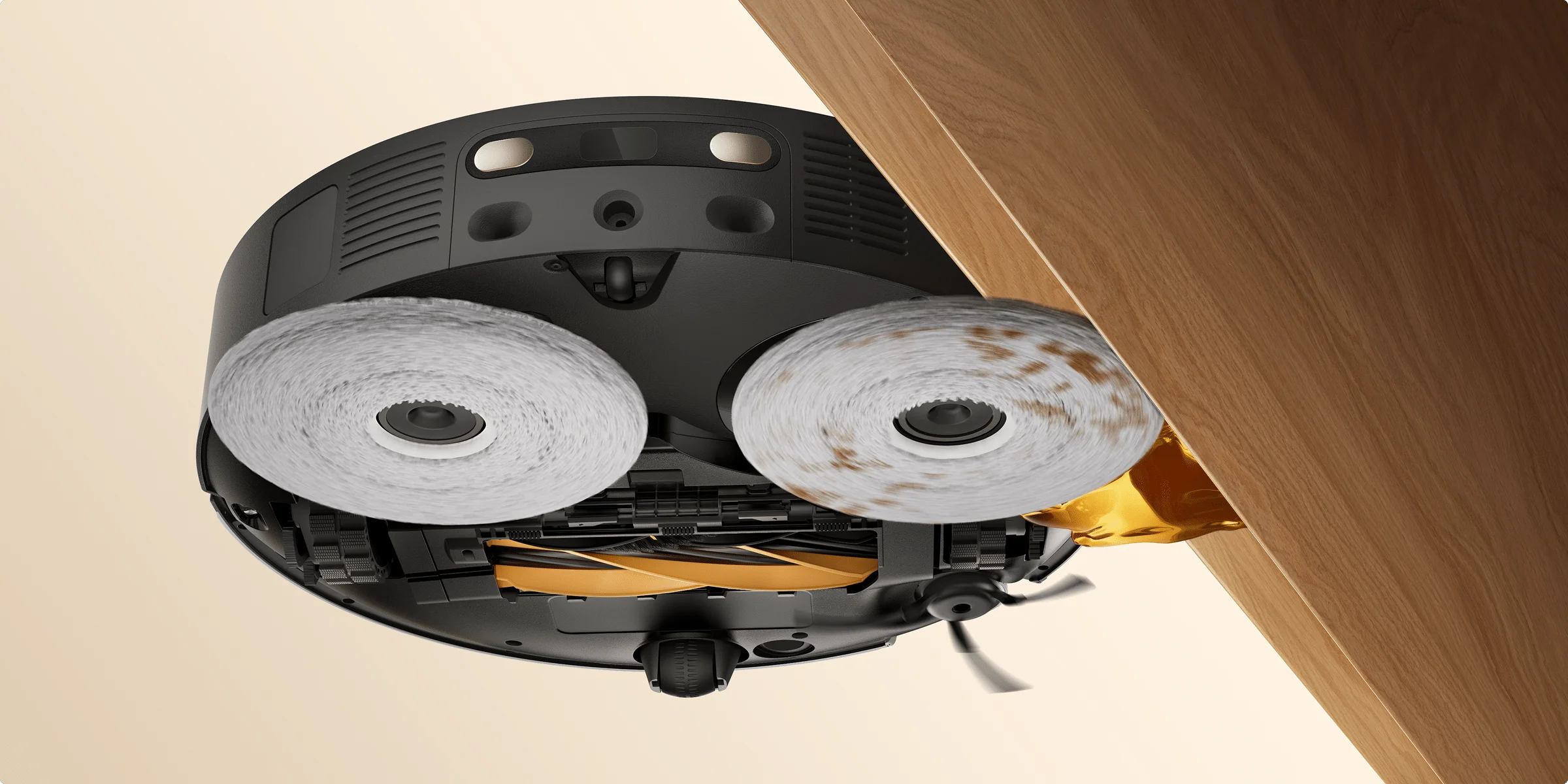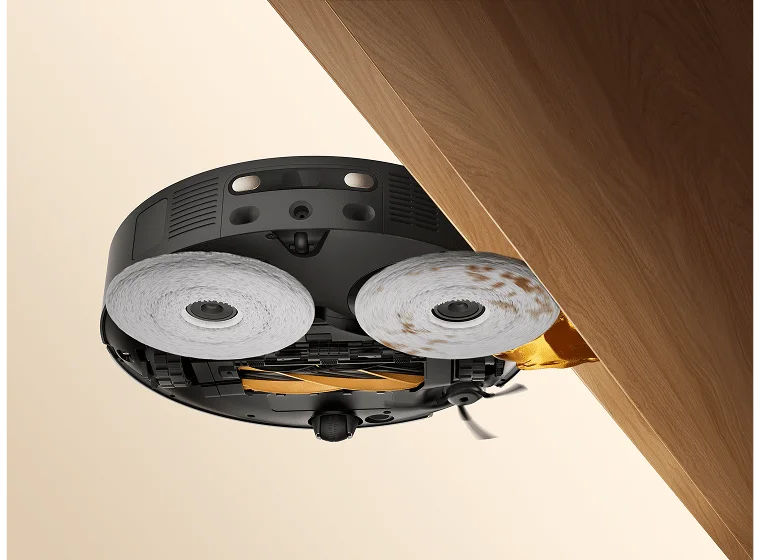 Η πλευρική βούρτσα και η περιστρεφόμενη σφουγγαρίστρα με δυνατότητα προέκτασης φτάνουν σε άκρα, γωνίες και χαμηλά σημεία, καθαρίζοντας τα δάπεδα σε σοβατεπί και κάτω από έπιπλα για μεγαλύτερη κάλυψη.