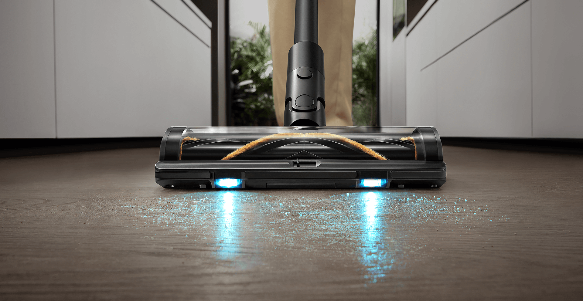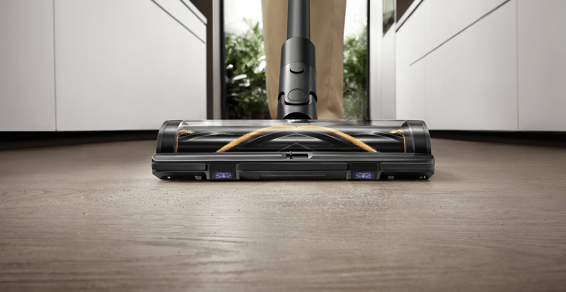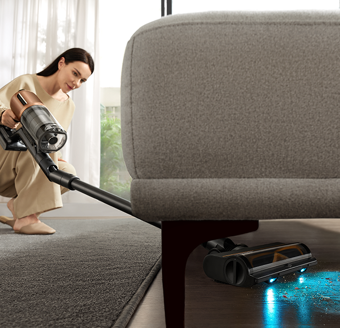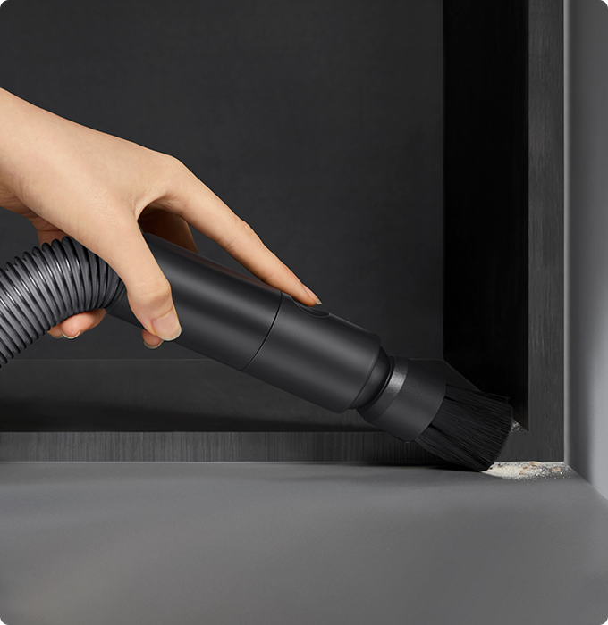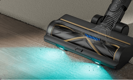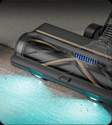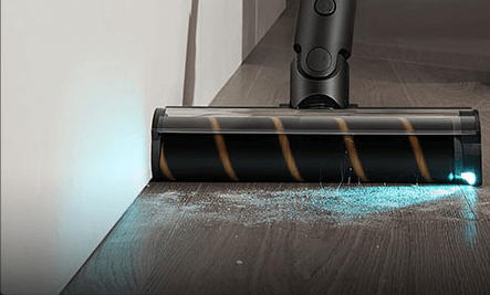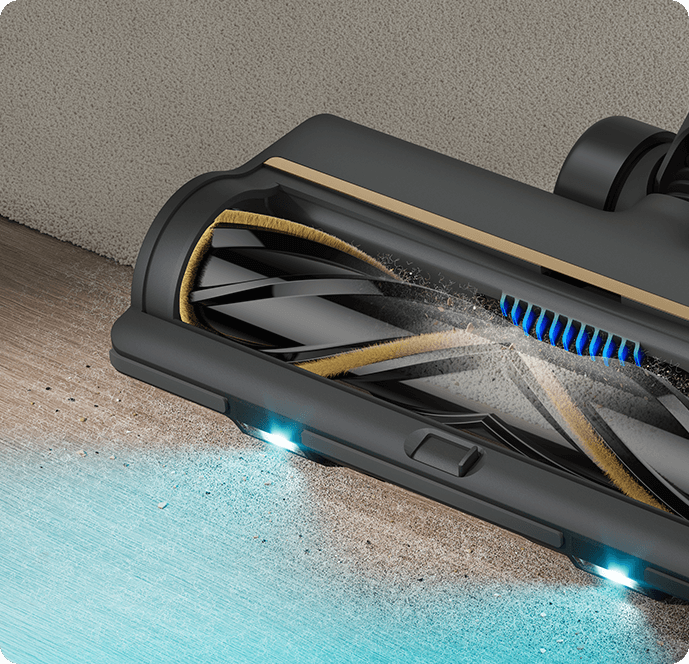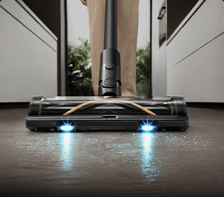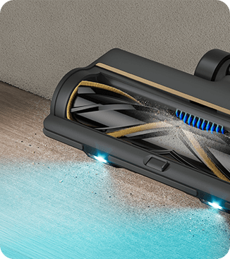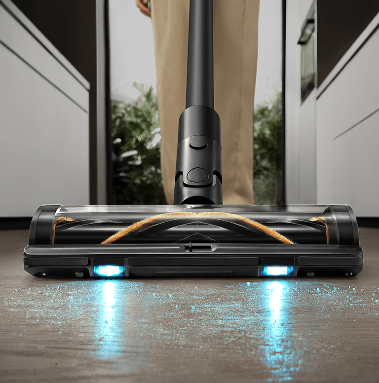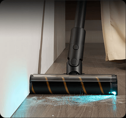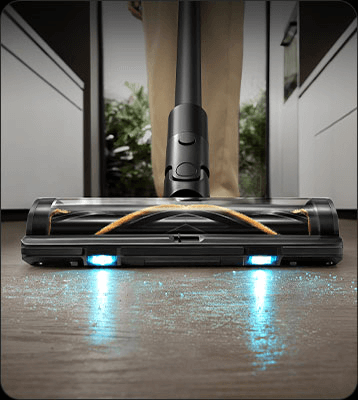 Die weiche Rollerbürste ist mit einem CelesTect-Licht ausgestattet, um versteckten Staub sichtbar zu machen und schwer zugängliche Kanten auf Hartböden effizient zu reinigen. Mit einem geringeren Abstand von 7 mm* zur Wand meistert sie die Herausforderungen bei der Kantenreinigung und nimmt Verschmutzungen entlang von Sockelleisten mühelos auf.