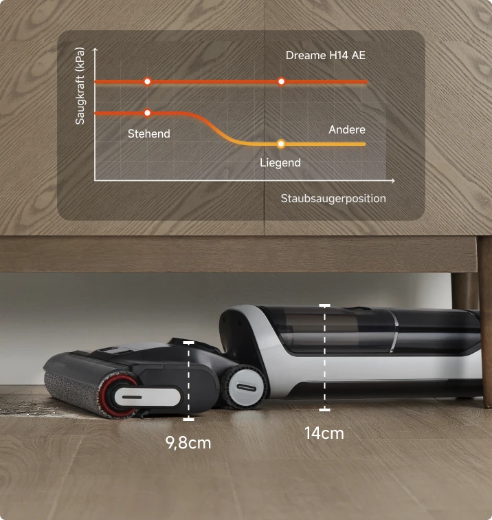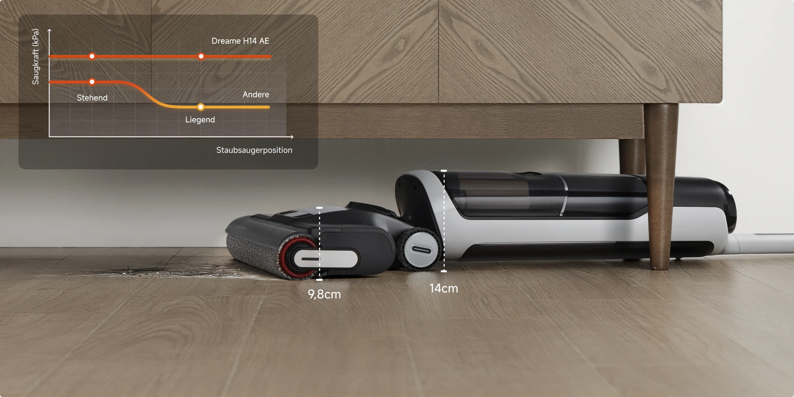 *180°, 14 εκ., 9,8 εκ.: Ολόκληρο το σώμα της ηλεκτρικής σκούπας μπορεί να φτάσει σε χώρους με ύψος μόλις 14 εκ. και η κεφαλή βούρτσας σε ύψος μόλις 9,8 εκ.