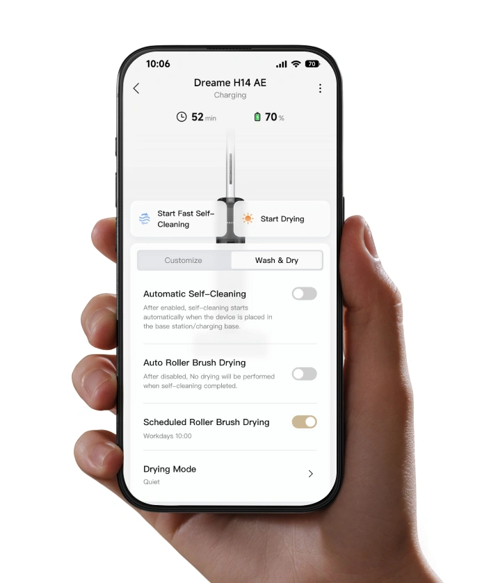 Με 6 μπαταρίες 4.000 mAh, η H14 AE προσφέρει έως και 45 λεπτά χρόνου λειτουργίας στην Αθόρυβη λειτουργία*, εξασφαλίζοντας απρόσκοπτο και αποτελεσματικό καθαρισμό από την αρχή έως το τέλος.