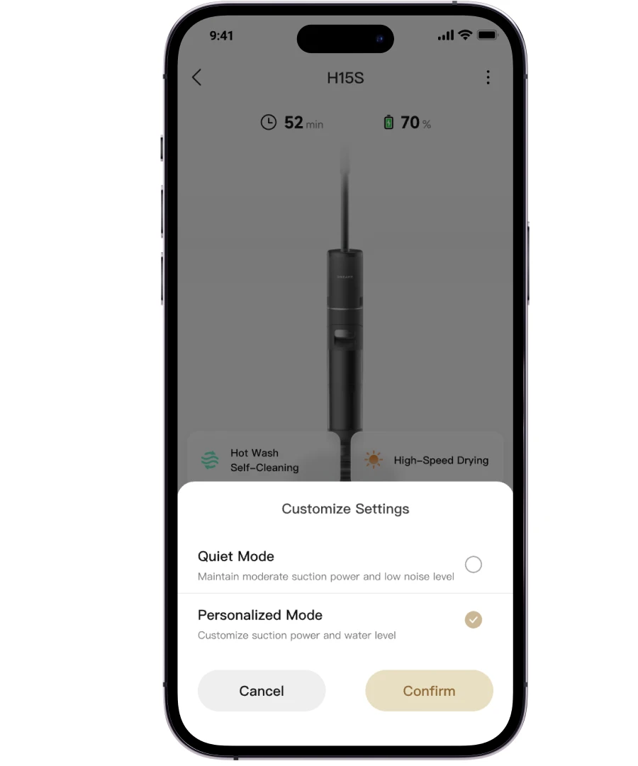 Η H15S προσαρμόζει αυτόματα την ισχύ ανάλογα με τους λεκέδες, ώστε να χειρίζεται εύκολα τις τρίχες κατοικίδιων και τα επίμονα ψίχουλα για βαθύ καθαρισμό, ενώ βελτιστοποιεί την κατανάλωση ενέργειας.