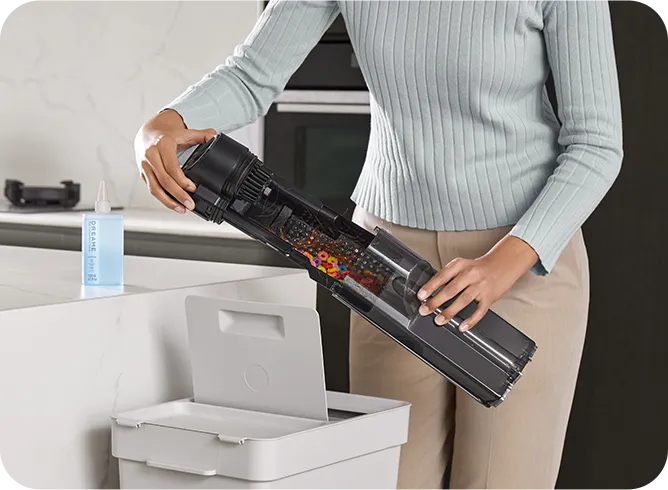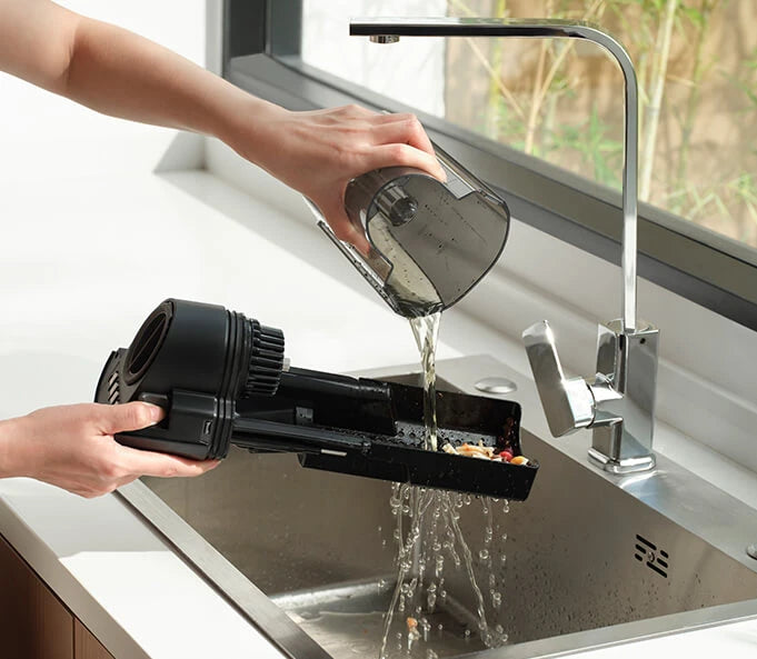 Το δοχείο φιλτραρίσματος εύκολου αδειάσματος διαχωρίζει τις στερεές βρομιές από τα υγρά απόβλητα, για γρήγορο και εύκολο τελικό καθαρισμό.