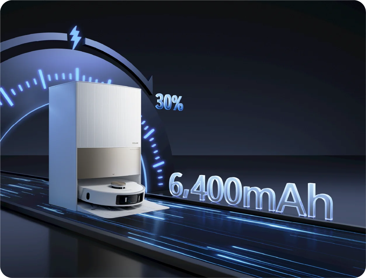 Η προηγμένη τεχνολογία της Dreame ενισχύει σε μεγάλο βαθμό την ταχύτητα φόρτισης για τη μεγάλη μπαταρία 6.400 mAh, εξασφαλίζοντας ότι η σκούπα-ρομπότ σας είναι έτοιμη για τον επόμενο καθαρισμό.