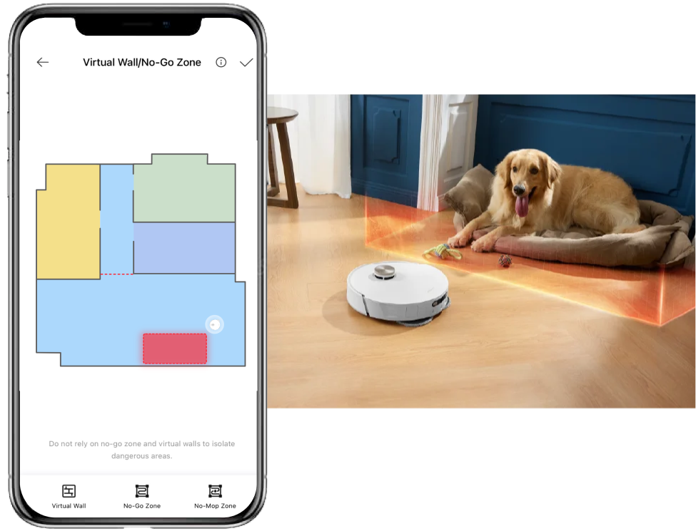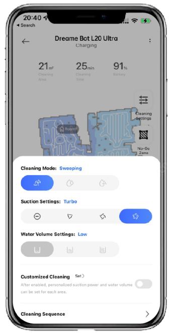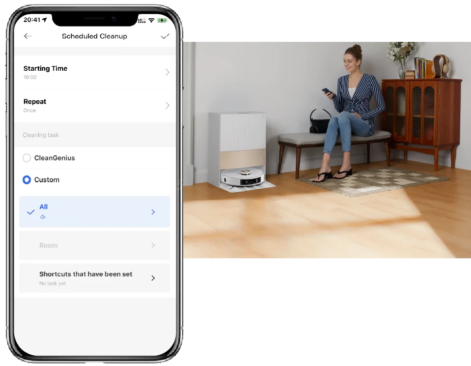 Αναλάβετε τον έλεγχο μέσω της εφαρμογής, για να προσαρμόσετε τον καθαρισμό ανάλογα με το σπίτι και το πρόγραμμά σας. Διαχωρίστε δωμάτια, δημιουργήστε εικονικούς τοίχους, ρυθμίστε ζώνες μη μετάβασης ή προγραμματίστε καθαρισμούς, όλα αυτά από την άνεση του τηλεφώνου σας.