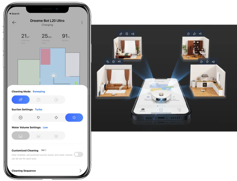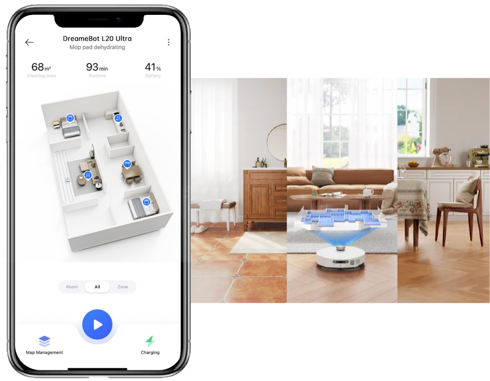 Κατεβάστε τη νέα εφαρμογή από το App Store ή το Google Play για την ομαλή εμπειρία σπιτιού της Dreame. Αναλάβετε τον έλεγχο μέσω της εφαρμογής, για να προσαρμόσετε τον καθαρισμό ανάλογα με το σπίτι και το πρόγραμμά σας. Διαχωρίστε δωμάτια, δημιουργήστε εικονικούς τοίχους, ρυθμίστε ζώνες μη μετάβασης ή προγραμματίστε καθαρισμούς, όλα αυτά από την άνεση του τηλεφώνου σας.