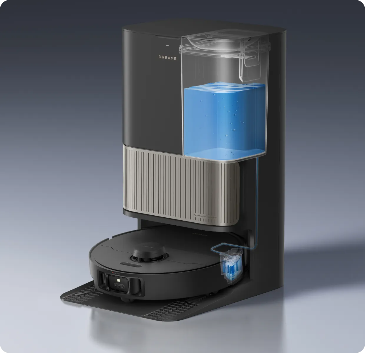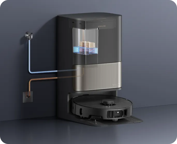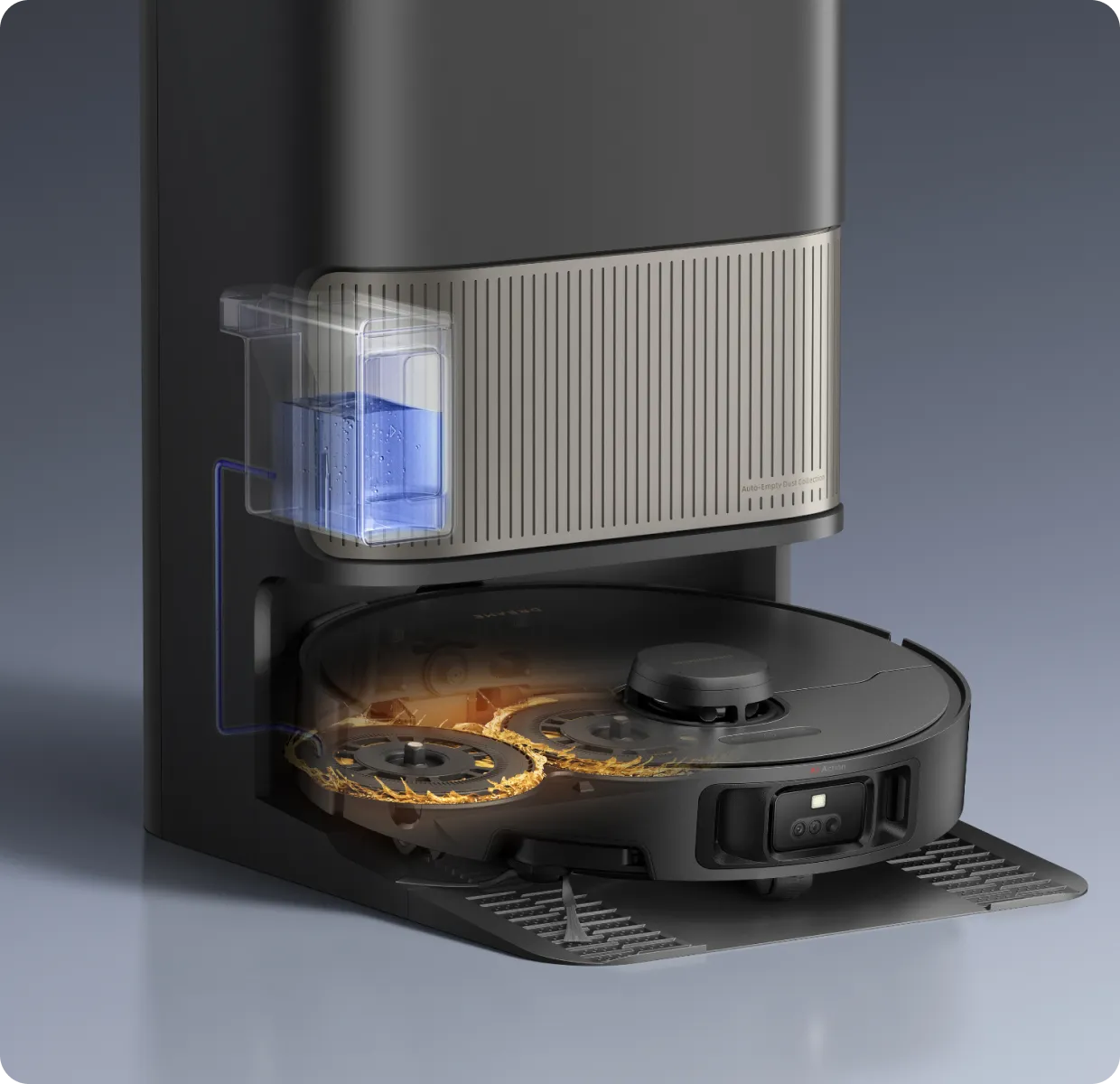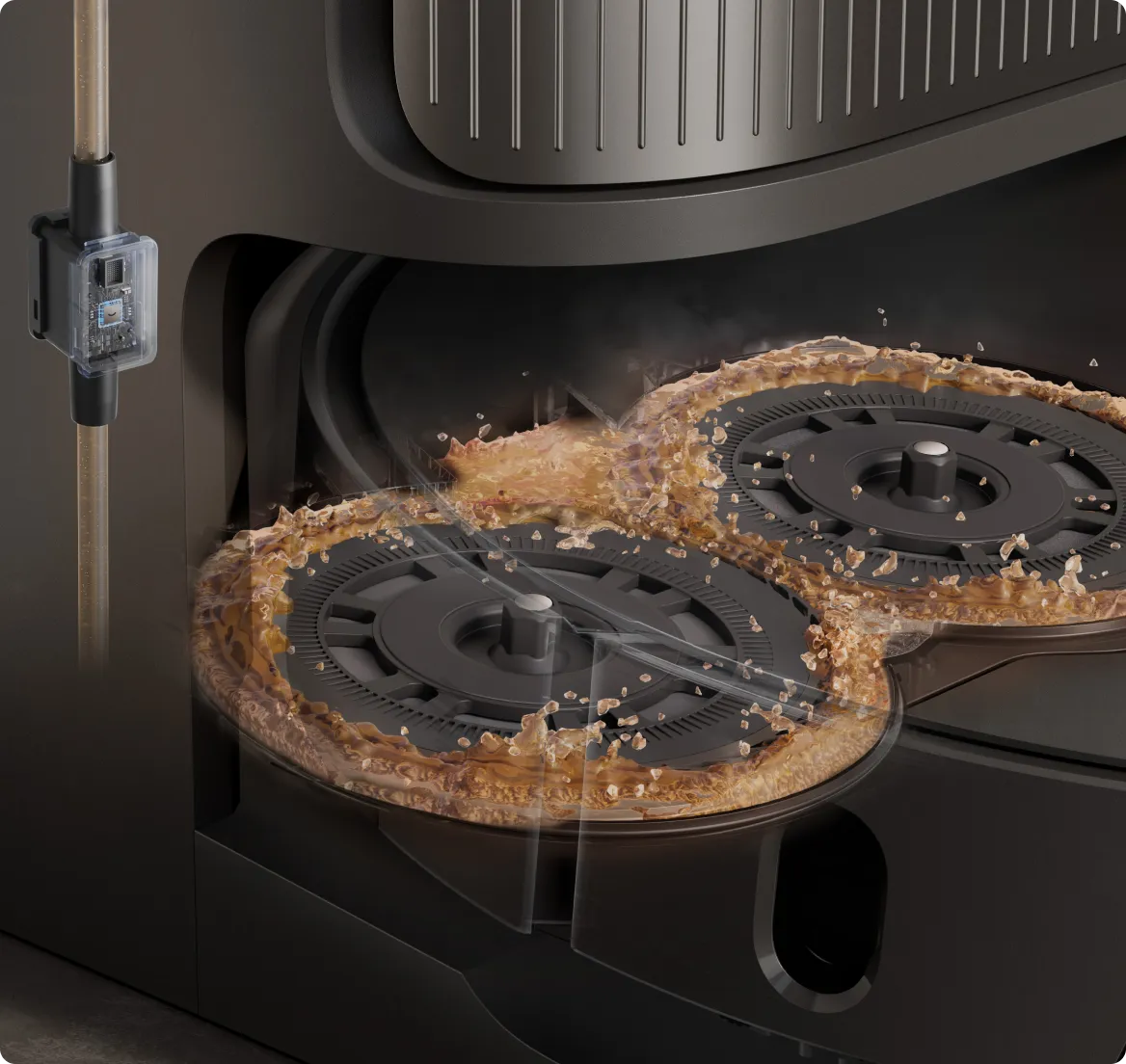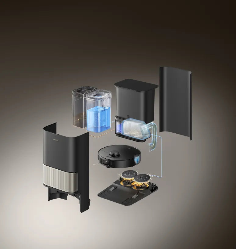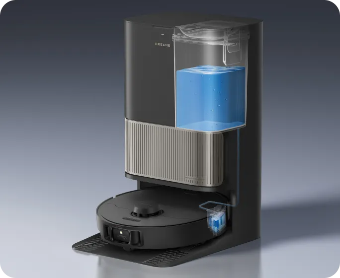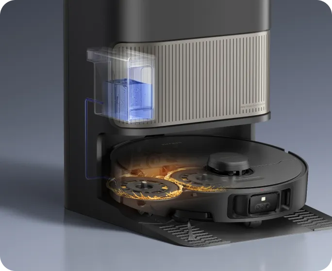 Μετά το σφουγγάρισμα, η βάση χρησιμοποιεί τον αισθητήρα χρώματος για να αξιολογήσει πόσο βρώμικα είναι τα υγρά κατάλοιπα. Εάν είναι πολύ θολά, η ηλεκτρική σκούπα-ρομπότ θα πλύνει ξανά τις σφουγγαρίστρες πριν από τον δεύτερο γύρο καθαρισμού και θα διασφαλίσει ότι τα δάπεδα καθαρίζονται πάντα με καθαρές σφουγγαρίστρες.