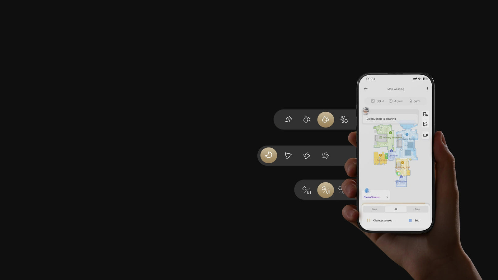 *Οι λειτουργίες Επανάληψη πλύσης σφουγγαρίστρας και Επανάληψη σφουγγαρίσματος δαπέδου γίνονται διαθέσιμες μόλις ο χρήστης τις επιλέξει στη λειτουργία CleanGenius™ της εφαρμογής Dreamehome.