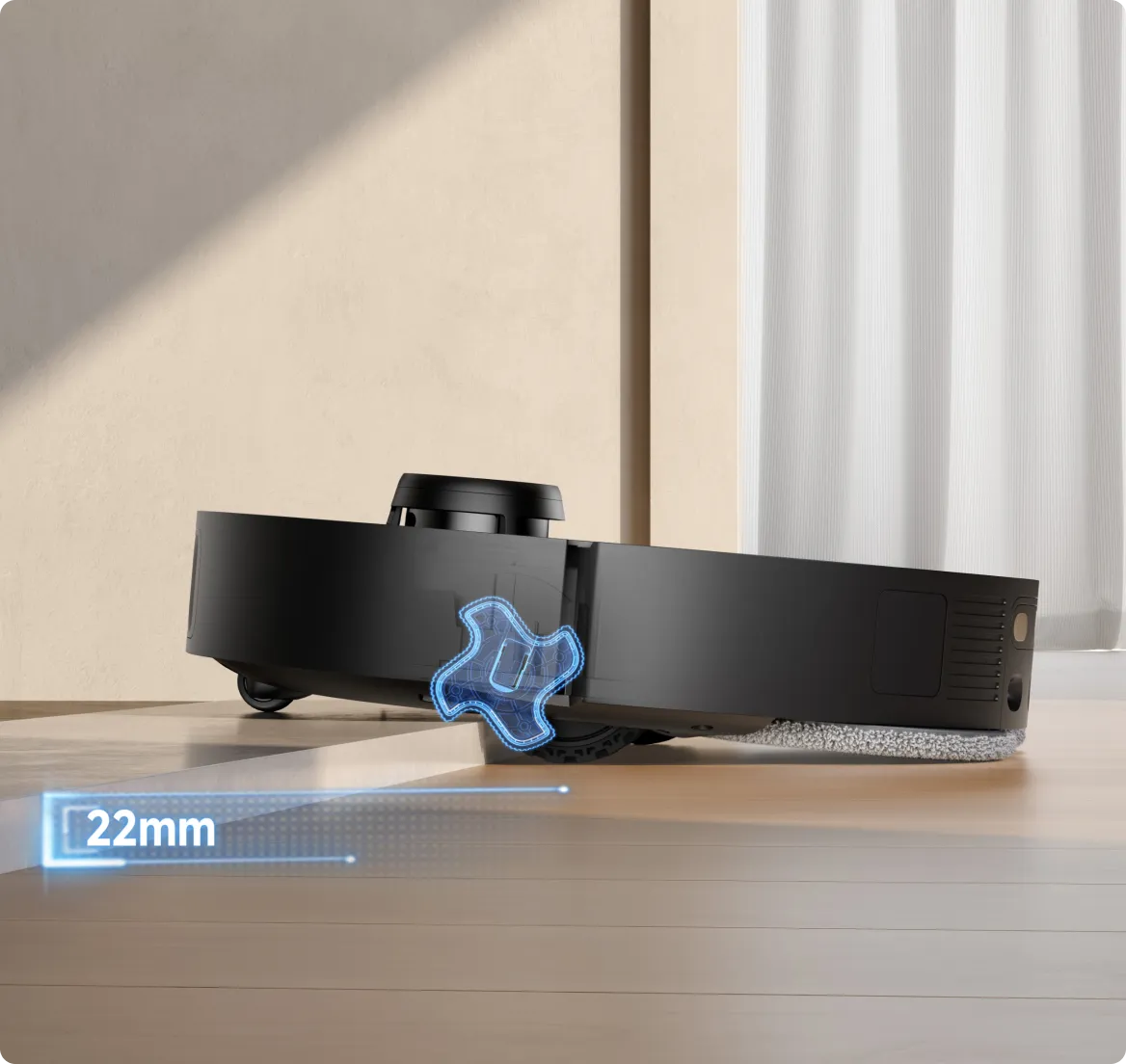 Το σύστημα EasyLeap™ διαθέτει 4 τροχούς που βοηθούν την ηλεκτρική σκούπα-ρομπότ να ανεβαίνει σκαλοπάτια και ράγες πορτών ύψους έως και 40 mm*. Ο σχεδιασμός αυτός είναι αποτελεσματικός ακόμα και σε υγρά δάπεδα, ολισθηρές επιφάνειες κουζίνας ή ράγες σε συρόμενες πόρτες.