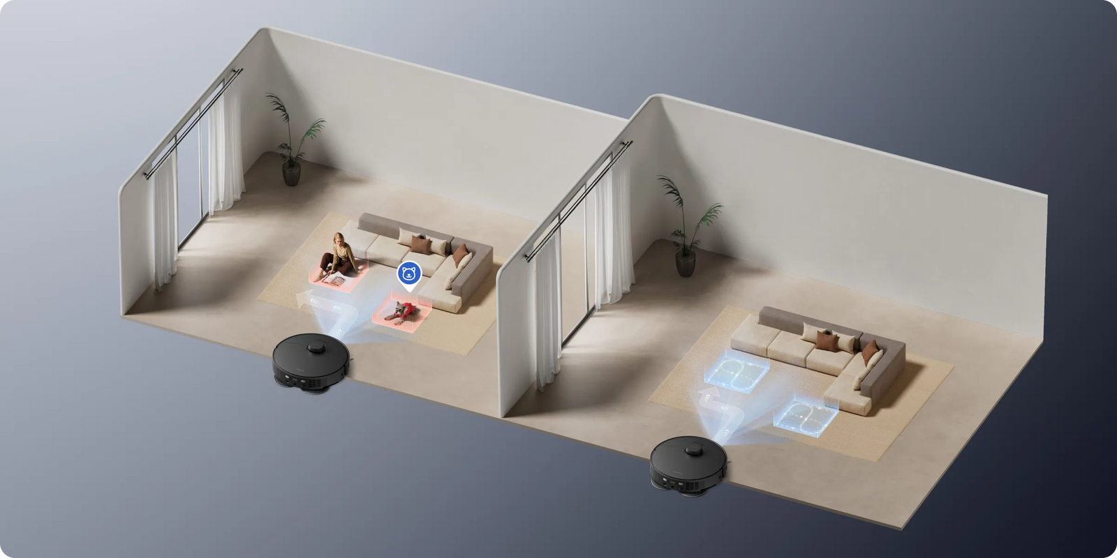 Σχεδιασμένη για ασφαλείς, φιλικές προς τα κατοικίδια κατοικίες, η L40s Pro Ultra αναγνωρίζει με ακρίβεια και κινείται γύρω από εμπόδια (μπολ τροφίμων/αμμολεκάνες κατοικίδιων), ανθρώπους και κατοικίδια ζώα, ενώ μπορεί να περάσει τα σημεία που παρέλειψε στη συνέχεια.