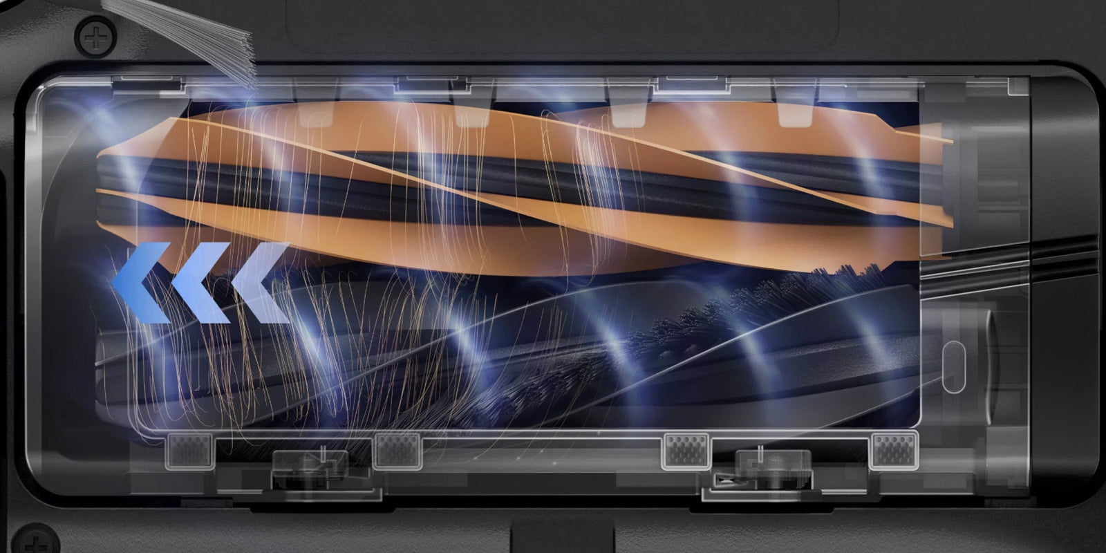 Κατασκευασμένη με 2 διαφορετικές βούρτσες εξαιρετικής κατασκευής, η Διπλή Βούρτσα απομάκρυνσης παγιδευμένων τριχών HyperStream™ξεπερνά τόσο τα χαλιά όσο και τα κενά στα σκληρά δάπεδα, χωρίς να αφήνει πίσω παγιδευμένες τρίχες ή σκόνη*.